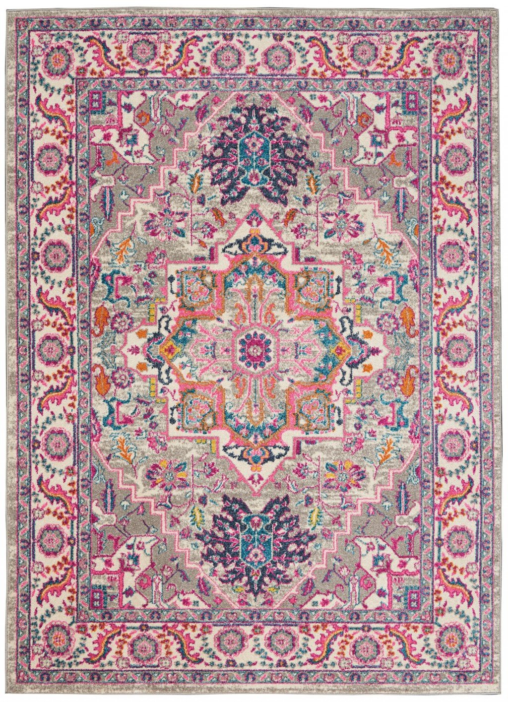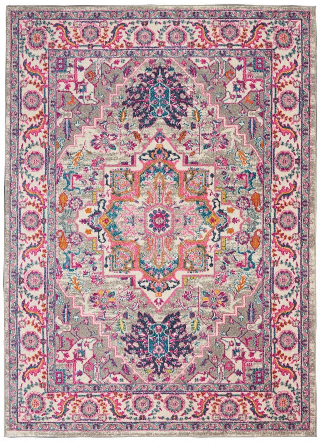 Add great coloration and comfortable texture to your space with this 4' x 6' pink and gray power loom area rug. Made in Turkey, this rug offers high quality combined with good looking designer sensibilities. Area Rugs help to give warmth and sense of home to your space. 1" H x 45" W x 69" D