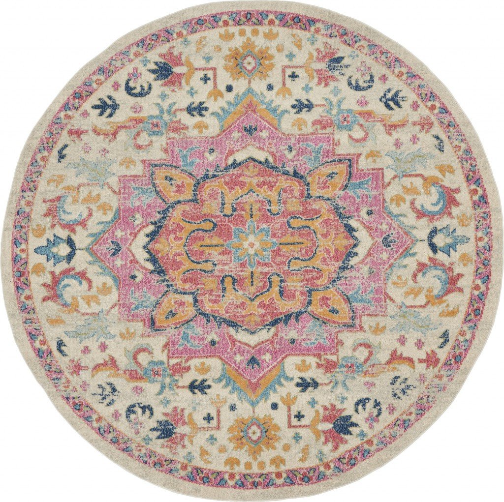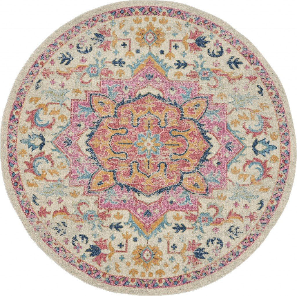8' Pink And Ivory Round Southwestern Dhurrie Area Rug